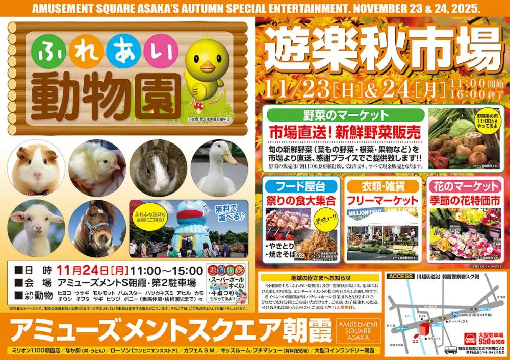 年に2回開催される「ふれあい動物園」が、今秋もアミューズメントスクエア朝霞の第2駐車場にやってきます!