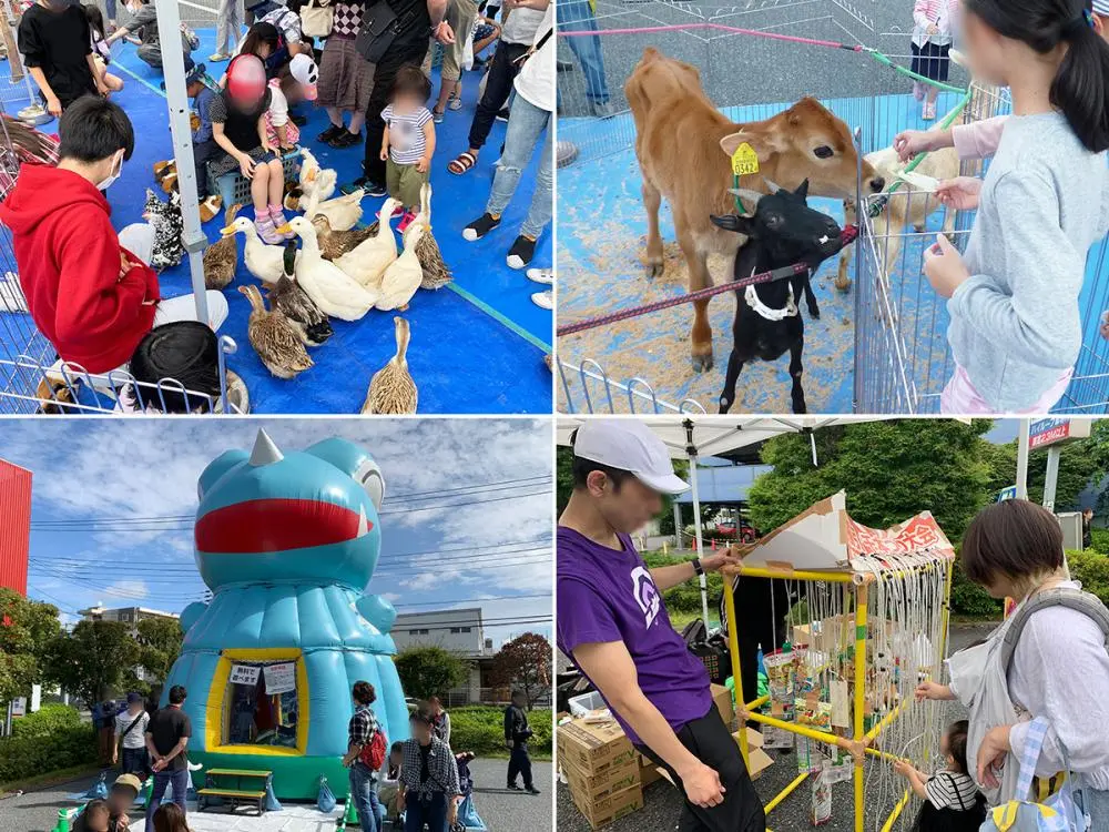 来場動物は変更する場合もありますが、種類も豊富で見応えもあります!さらに会場内にはふわふわ遊具や千本釣り・スーパーボールすくい等の縁日コーナーもあり、お子様は大満足間違いなし!ふれあい動物園とふわふわ遊具は無料で楽しめますよ♪